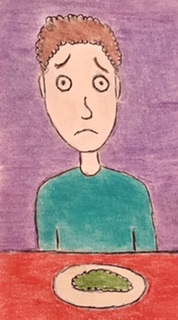 But he really is having a hard time, poor guy. I mean WHAT IS THAT AWFUL GREEN THING ON HIS PLATE? My best guess is a Dill Pickle Frittata with Grass Sauce.